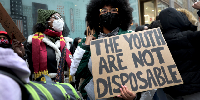 CHICAGO, ILLINOIS – JANUARY 14: Public school students protest outside of the Chicago Public Schools headquarters after walking out of their classrooms on January 14, 2022 in Chicago, Illinois. The students walked out of class to demand a voice in the ongoing battle between the school district and the teacher’s union over COVID-19 safety measures. (Photo by Scott Olson/Getty Images)
